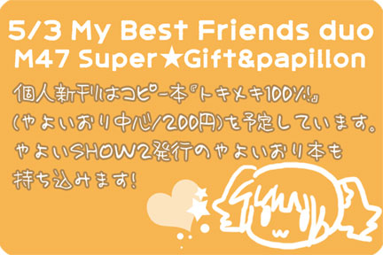 既刊はやよいSHOW2で発行したやよいおり本「Confetti!」があります。残部が気持ち少なめです。あとまた冬発行のPerfume本を置いてるかもしれません。